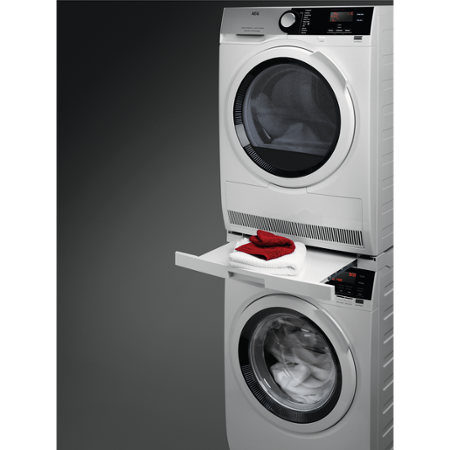 Uložení sušičky na pračku představuje prostorově úsporné řešení. Univerzální spojovací sadu lze použít pro všechny pračky a sušičky AEG s předním plněním a hloubkou od 52 do 67 cm.