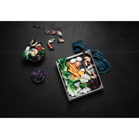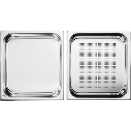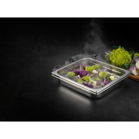 Láká vás vaření v páře, které zajišťuje skvělou chuť jídla, pěkné barvy a zároveň zachovává potřebné vitamíny a minerály? Se sadou nádob AEG A9OBGC23 to bude snadné. Sada obsahuje 2 nádoby pro vaření masa, ryb, zeleniny, rýže či dalších příloh. Jsou vyrobeny z vysoce kvalitní nerezové oceli. Malé otvory v nádobě umožňují páře cirkulovat a zároveň odvádí přebytečnou vodu, potraviny tak budou šťavnaté. Už se nemusíte bát nevábně vypadající šedé brokolice nebo vyschlého masa. Sada je optimalizována k použití v parních troubách. Snadno ji umyjete v myčce na nádobí. Vařte zdravěji se sadou nádob AEG.