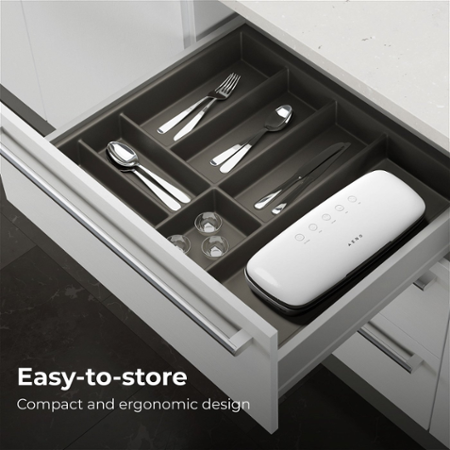 Vakuovačka AENO o délce 38 cm a tloušťce necelých 6 cm nezabírá mnoho místa a vejde se na každou polici