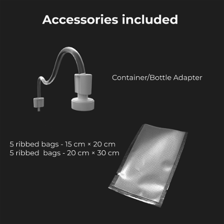 5 žebrovaných sáčků (15 x 20 cm), 5 žebrovaných sáčků (20 x 30 cm), adaptér na nádobu