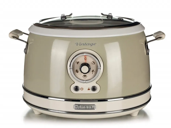 Rýžovar je praktický pomocník do domácnosti. Co kdyby toho ale uměl ještě víc? Retro hrnec od italského výrobce Ariete je specialista úplně na všechno. Jednoduchým pootočením kolečka ho proměníte v hrnec na pomalé vaření, parní hrnec nebo si připravíte třeba lahodnou omeletu. Máte chuť na zeleninu v páře? Zvolte program parního vaření, dejte zeleninu do parního koše a pár minut počkejte. Chcete si jen tak orestovat mořské plody? To taky zvládne. Skvěle připraví i takzvané “tažené” polévky nebo omáčky díky funkci pomalého vaření. S tímhle přístrojem zvládnete i několikachodové menu najednou. Multifunkční hrnec je dalším modelem řady Ariete Vintage, která klade důraz nejen na praktičnost, ale i na originální design. Tenhle přístroj budete jednoduše milovat.