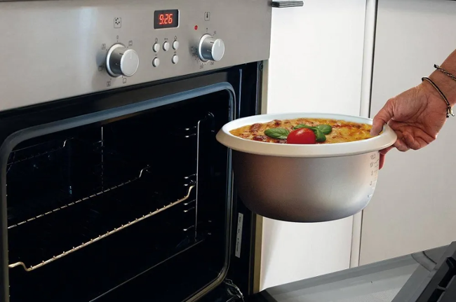 Velkým plusem je nádoba s nepřilnavým povrchem, která zvládne i 20minutový pobyt v troubě rozpálené na 180-200 °C. Pokud tedy chcete rýžovému nákypu dopřát zlatou kůrčičku navrch, nemusíte špinit další nádobí.