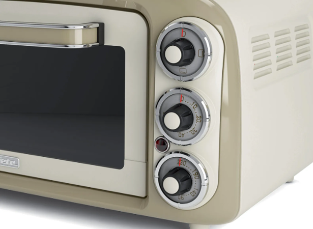 Elektrická trouba Ariete Vintage 979 v krémové barvě má jedinečný design i funkce. Přístroj má objem 18 litrů a snadno pro něj najdete místo na každé kuchyňské lince. Ovládání je velmi jednoduché a nabízí tři funkce pečení (horní, spodní, oboustranné) na třech úrovních od 90 do 230 stupňů. Minutka, kterou lze nastavit až do 60 minut, umožňuje hlídat délku pečení. Spotřebič skvěle poslouží i jako pec na pizzu, v zadní části je totiž vyboulená tak, aby se do ní vešla pizza o průměru 30 cm.