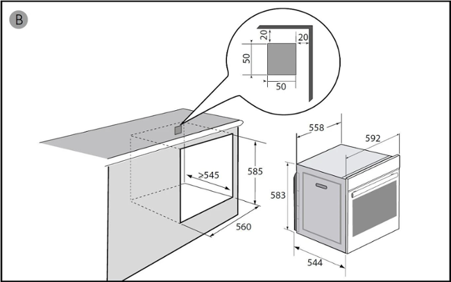• Rozměry otvoru pro vestavbu (V x Š x H): 58,5 x 56 x 55 cm