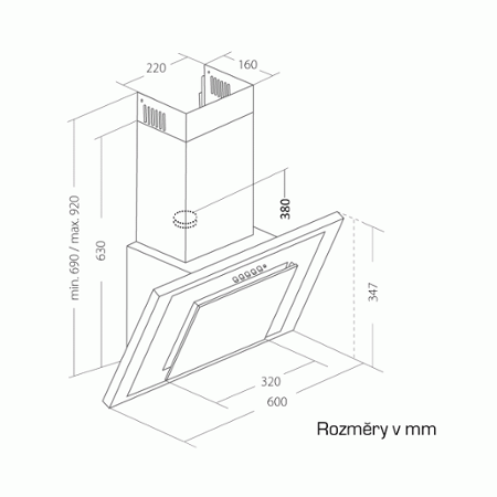 Upřesnění: Korpus a velký šikmý panel je z bíle lakovaného plechu / Středový (menší) panel je z mléčně bílého skla