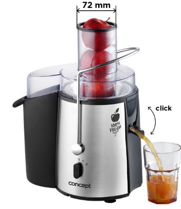 Už Vás nebaví trávit v kuchyni veškerý svůj čas? Chcete mít zdravou čerstvou šťávu denně na svém stole? Tak právě pro Vás je tu lis na ovoce a zeleninu od Conceptu. Díky svému 72 mm velkému plnicímu otvoru ušetříte spoustu času. Nemusíte se zdržovat zbytečným krájením ovoce, zvládne i celé plody.