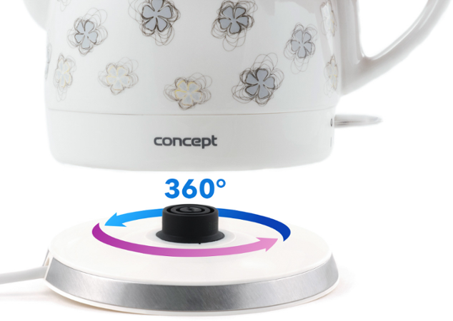 Keramická konvice je vybavena dvojnásobným bezpečnostním systémem, tzn. že se automaticky vypne po dosažení bodu varu nebo v momentě, kdy ji omylem zapnete prázdnou, takže nedochází k jejímu poškození. Hlavní spínač slouží současně jako kontrolka provozu, která se rozsvítí vždy, když je konvice zapnutá. Pro rychlejší manipulaci je vybavena plně otočným podstavcem, na který ji můžete usadit z jakéhokoliv úhlu. Nechybí ani praktický prostor pro uschování přebytečného kabelu.