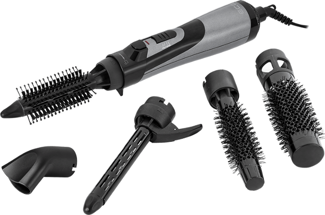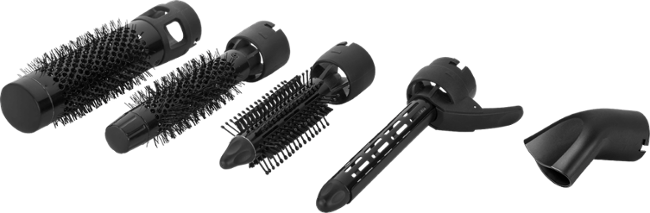 Horkovzdušná kulma, 2 stupně výkonu a teploty, fixace chladným vzduchem, 360° otočný kabel, 5 odnímatelných nástavců