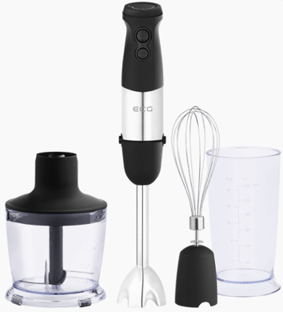 • Snadno vyměnitelné nástavce: Nerezový šlehač, sekáček na potraviny a nádoba s objemem 500 ml