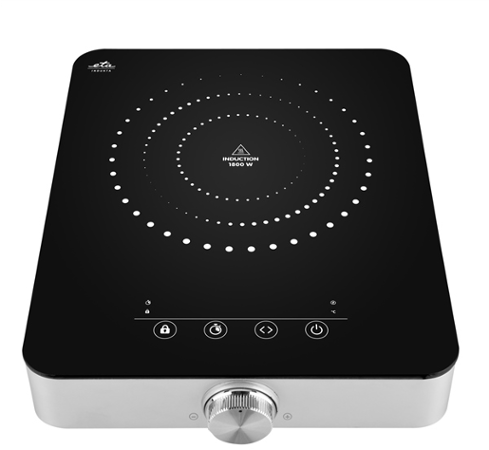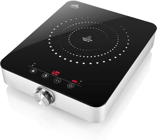 Indukční vařič ETA s příkonem 1800 W má elegantní nerezový design se sklokeramickou deskou a s indukční zónou o průměru 10-20 cm, na kterou lze použít nádoby s průměrem dna 12 až 24 cm.