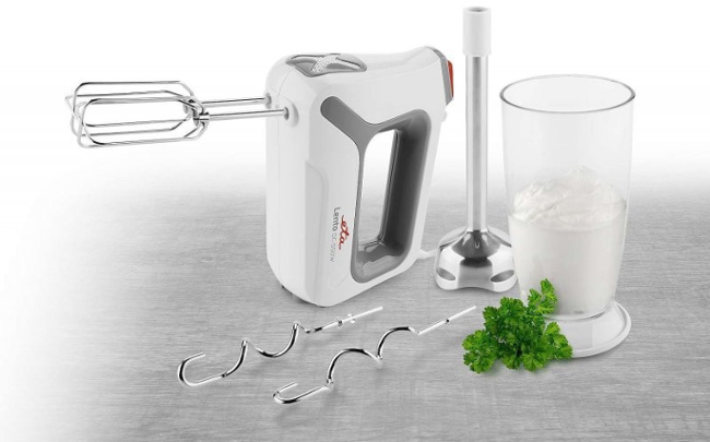 Ruční mixér příkon 550W, 4 rychlostní stupně, funkce pro maximální otáčky, délka napájecího kabelu 1.2m, deklarovaná hladina akustického výkonu 81db(a) re 1pw, příslušenství: 2 dlouhé metly a 2 háky, odnímatelný nerezový tyčový mixér, pracovní nádoba o objemu 800ml