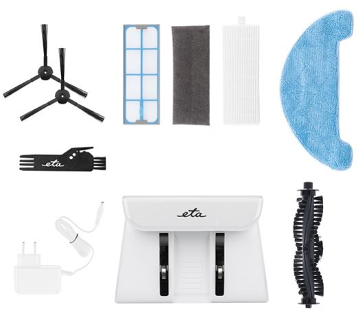 Spolu s robotickým vysavačem obdržíte nabíjecí základnu, napájecí adaptér, dálkový ovladač, virtuální zeď, čisticí kartáček s nožem, nástavec na mopování se zásobníkem na vodu o objemu 300 ml a mopovací textilii.