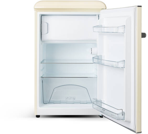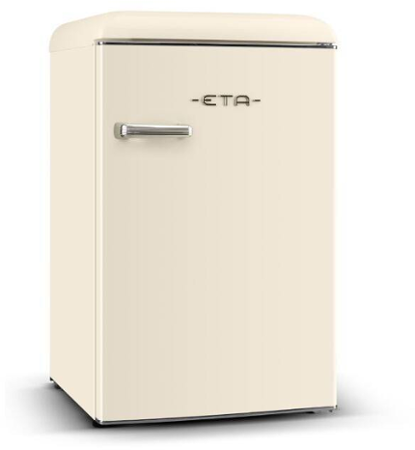 Jednodveřová chladnička s mrazákem, výška 90 cm, objem chladničky 92 l / mrazničky 18 l, energetická třída E, LED vnitřní osvětlení, retro design, výškově stavitelné nožky, hlučnost 38 dB, V × Š × H: 90 × 55,2 × 61,7 cm Další informace