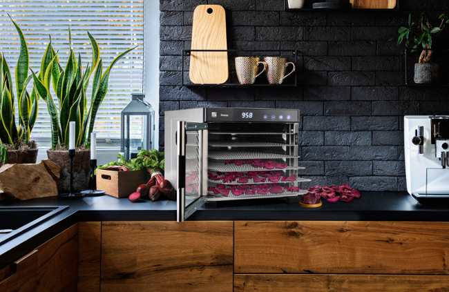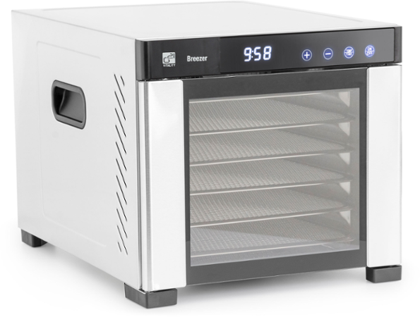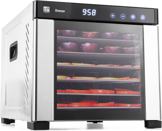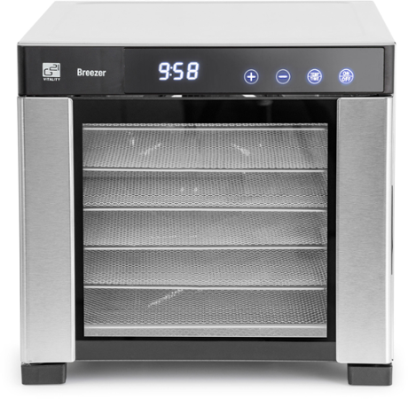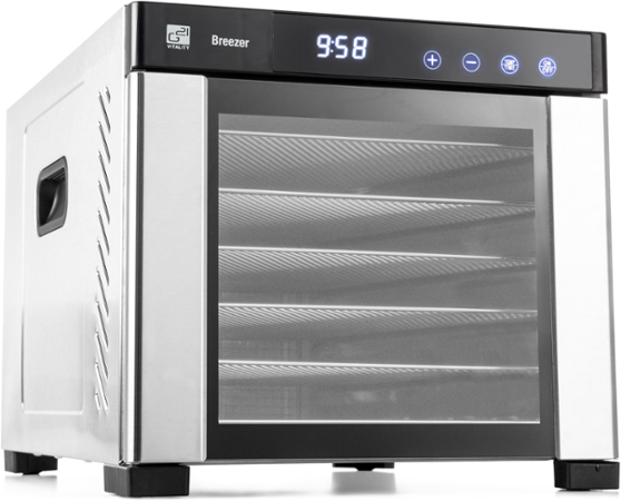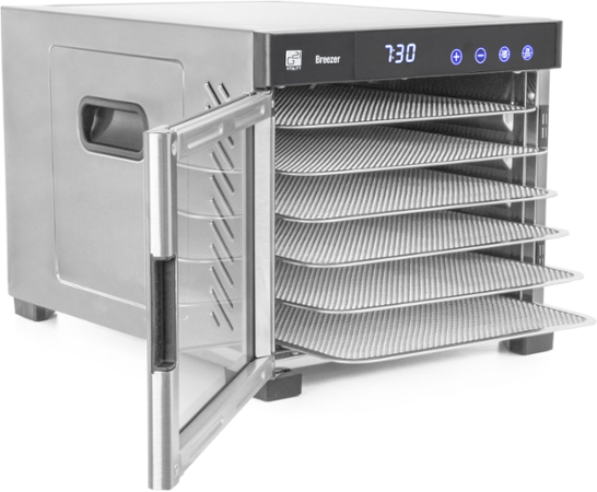 Horizontální sušička potravin G21 Breezer je menší sestrou sušičky G21 Mistral. Se svými 6 nerezovými sušícími tácy a 6 jemnými sušícími vložkami je díky kompaktnějšímu provedení ideální pro domácí použití nebo do provozů s menší pracovní plochou. Veškeré ovoce, zeleninu, bylinky, houby i maso usuší dokonale, rovnoměrně a jednoduše. Nemusíte přeskládávat plata ani otáčet suroviny. Dokonce se nemusíte zabývat ani údržbou sušičky, díky použitým materiálům je odolná a snadno se čistí.