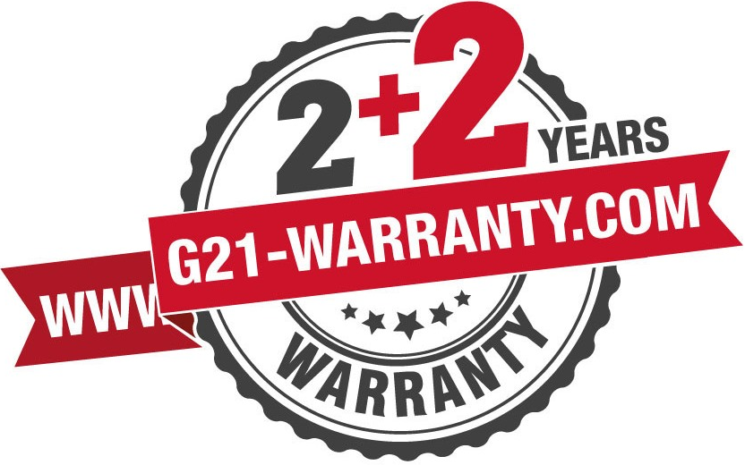 Za kvalitu tohoto produktu ručíme 4 roky*. Ke standardní záruční lhůtě 2 roky získáte registrací na webu http://g21-warranty.com prodloužení záruky o další 2 roky. Využijte tuto možnost a po koupi se zdarma zaregistrujte. Prodloužená záruka 2 + 2 roky se vyplatí!