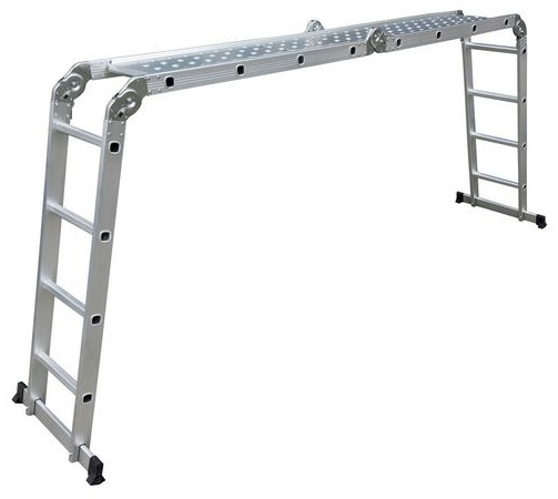 Hliníkový multifunkční žebřík (štafle) s pevnou konstrukcí, lehkými duralovými profily. Žebřík 4,6m, přenosné lešení, štafle. Ve složeném stavu 2,32 m. Další informace