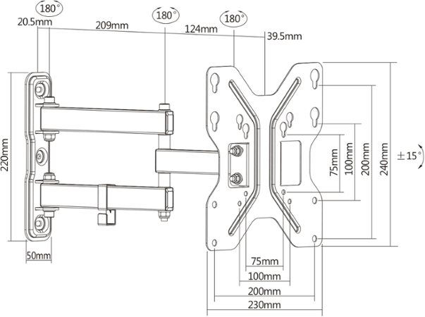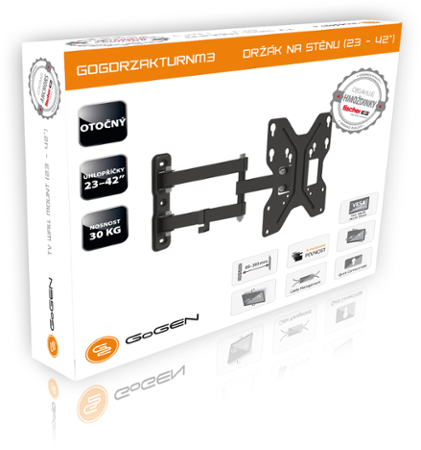 Univerzální otočný / polohovatelný nástěnný držák značky GoGEN pro LED, LCD a plazmové televize pro nastavení ideálního úhlu k pohodlnému sledování TV. Držák nabízí rychlou a snadnou instalaci na zeď díky kompletnímu montážnímu příslušenství. Disponuje inteligentním systémem fixace TV panelu s VESA standardy až do hodnoty 200 x 200 mm a širokým rozsahem pohybu až 180° otočení, -15° až +15° naklopení a 49 až 393 mm vysunutí. Konstrukce držáku je testována pro panely o úhlopříčce až 42" a o hmotnosti 30 kg.