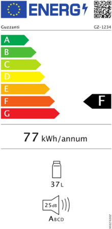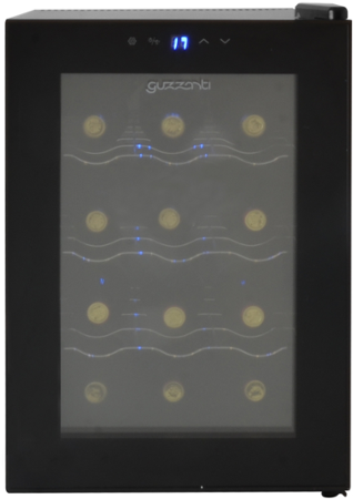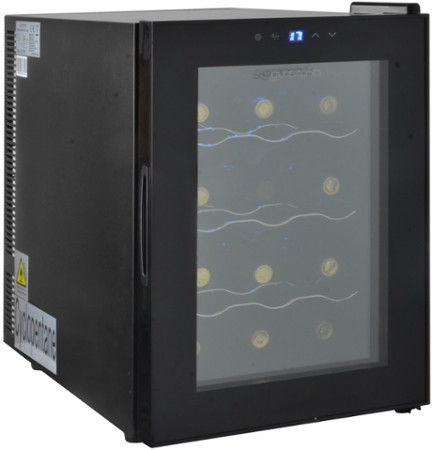 Vinotéka, kapacita 12 lahví, vnitřní objem 37 l, jedna teplotní zóna, energetická třída F, chromové drátěné police, vnitřní modré LED osvětlení, LED displej, chladicí rozsah 10-18 °C