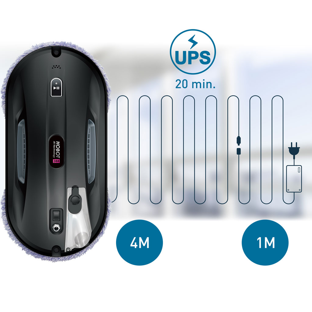 Napájecí kabel je dlouhý 4 metry, což umožňuje, aby HOBOT pracoval na velké ploše nebo i když je síťová zásuvka daleko od okna. Vestavěnou UPS záložní baterii využijete v případě náhlého výpadku elektrického proudu. Dalšími bezpečnostními prvky je několik senzorů, které neustále vyhodnocují situaci a bezpečnostní lano.