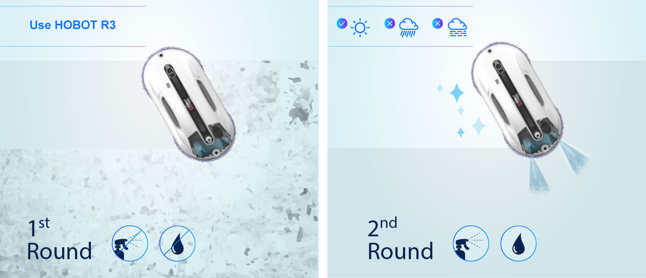 HOBOT R3 využívá unikátní systém pohybu, při kterém traverzuje po povrchu a precizně čistí skla oken. Robotický čistič oken HOBOT R3 automaticky rozpozná velikost čištěného povrchu a zvládne vyčistit velké plochy o šířce až 5 m a výšce 6 m. Minimální velikost čištěného povrchu je 35 x 35 cm. Navigační systém s AI-Techonology, Gyro senzor a podtlakový senzor kontrolují pohyb robota po čištěném povrchu. Pomocí dálkového ovládání nebo chytrého telefonu můžete aktivovat funkci dvojitého čistícího cyklu.