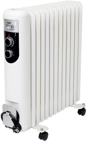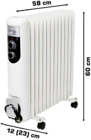 Olejový radiátor určený pro ohřívání vzduchu v interiérech, který má volitelné 3 stupně ohřevu 1000 W / 1500 W / 2500 W.