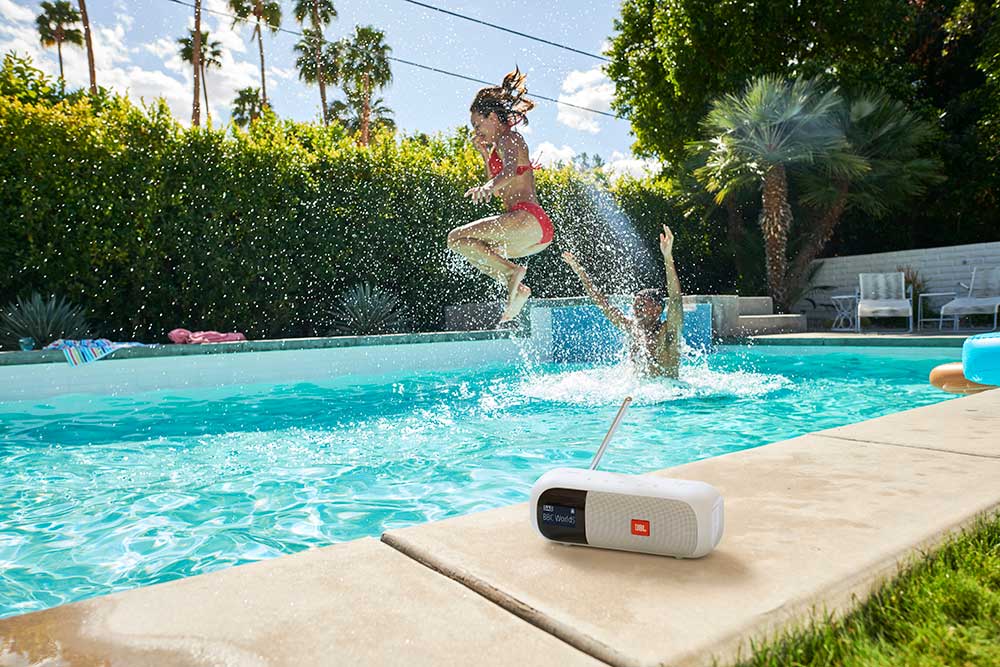 Poslouchejte své oblíbené stanice v parku nebo u bazénu. JBL Tuner 2 má voděodolnost IPX7, takže můžete poslouchat téměř kdekoli.