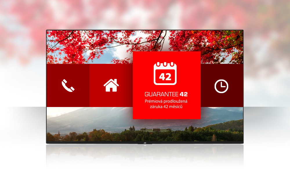 Za kvalitou našich výrobků si stojíme, a proto Vám rádi poskytneme delší záruční lhůtu, která je součástí balíčku prémiových služeb. Součástí je i domácí servis pro úhlopříčky nad 49“, který zahrnuje návštěvu technika u Vás doma v případě záručního zákroku. Pro získání prodloužené 42měsíční záruky je nutná registrace nákupu na www.jvc-tv.cz/guarantee-42/.