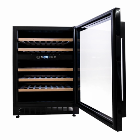 Elegantní vestavná vinotéka Kluge KCW4602B se 2 nezávislými chladícími zónami a 5 polovýsuvnými dřevěnými policemi s celkovou kapacitou 46 lahví.