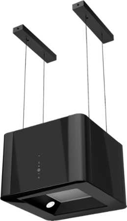 Ostrůvkový odsavač par v provedení černý kov a černé sklo, dotykové ovládání + dálkový ovladač, 3 stupně výkonu + BOOST, výkon odtahu 255 - 460 m3/h, výkon odtahu BOOST až 590 m3/h, hlučnost ve standardním režimu 47-59 dB(A), hlučnost BOOST 65 dB(A), roční spotřeba energie 65,9 kWh/a, energetická třída C (energetický štítek C,B,A,G), osvětlení 4 x LED žárovka GU10, 1 ks hliníkový tukový filtr (součást balení), filtry z aktivního uhlíku pro režim recirkulace: 2x FR-7944 (závitový na motor, není součástí balení), rozměry odsavače (V x Š x H): 320 x 450 x 450 mm, rozměry zavěšeného odsavače (V x Š x H): 820 až 2320 x 450 x 450 mm