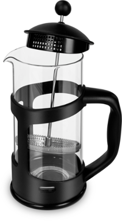 French press, objem 1L, skleněná čajová konvice, madlo vyrobeno z odolného plastu, nerezové stlačovací sítko pro čaje a mletou kávu, materiál plast / sklo