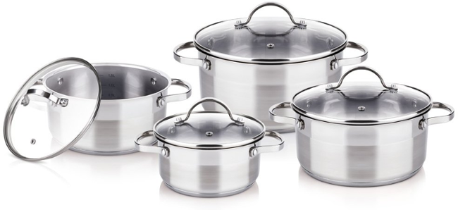 Sada nádobí 8 dílů, nerezové, sendvičové dno, poklice z odolného skla, pro všechny typy sporáků