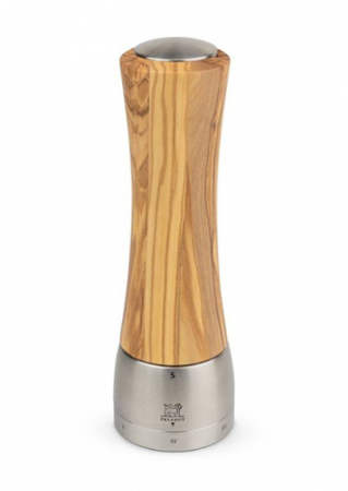 Moderní, 21 cm vysoký mlýnek s čistými liniemi, příjemný do ruky. Je ukázkou perfektní vyváženosti spojení dvou naprosto odlišných materiálů – měkce hřejivého olivového dřeva a chladné, robustní nerez oceli. Kombinace nádherně zbarveného dřeva a nerez oceli působí velmi esteticky. Mlýnek je standardně vybavený systémem u´Select, má ale lehce inovovanou vnitřní konstrukci. Skutečně lehce se naplňuje, protože vnitřní prostor nezmenšuje centrální ocelová osička. Zvětšilo se tak i místo na sůl, kterou snadno doplníte po sundání magnetického uzávěru z nerez oceli. Při mletí si můžete vybrat v rozmezí 6 nastavených hrubostí. Na mlecí mechanismus, který je vyroben z nerezové oceli 18/10, navíc specificky ošetřené pro vyšší odolnost proti korozi a opotřebení, a tedy pro dlouhotrvající ostrost, je poskytována celoživotní záruka.