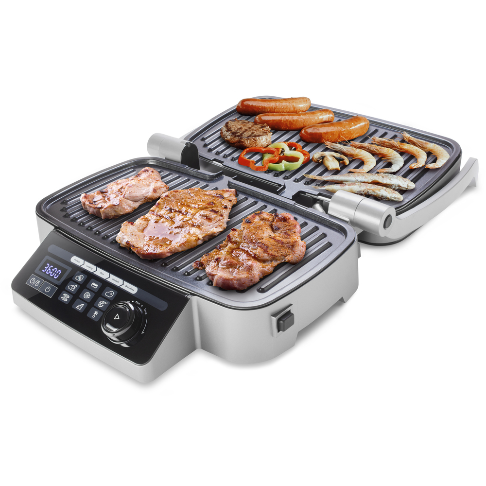 Inteligentní gril PHGR9000 váš pokrm ugriluje rychle a výsledek bude skutečně chutný. Na výběr budete mít z 9 automatických programů, u kterých jen zadáte míru propečení, a gril se pak sám postará o výsledek. Úspěch je postaven na přesném měření tloušťky grilovaného pokrmu a 3 teplotních senzorech na grilovacích deskách. Máte ale možnost si i sami nastavit po jakou dobu a jakou teplotou se má pokrm připravovat. Gril ocení i početnější rodiny s přáteli, nebude problém při otevřeném grilu připravit hostinu až pro 8 lidí naráz. Desky jsou totiž asi o 30 % větší, než je běžné u kontaktních grilů. Díky nepřilnavému povrchu grilovacích desek není příliš namáhavý úklid po grilování. Desky a odkapávací misku je možné umístit do myčky a udělat si to tak ještě snazší. Plochy mimo grilovací prostor a jeho bezprostřední okolí zůstávají chladné a tím se výrazně snižuje riziko nechtěného popálení.