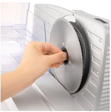 - Odnímatelné části pro snadné čištění a mytí (pojezd, přítlačný podavač, krájecí kotouč)
