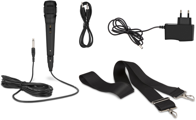 - Příslušenství: dobíjecí apatér (DC 9V, 1A), mikrofón s 5m kabelem, textilní pásek pro přenášení, 3,5mm AUX kabel, návod