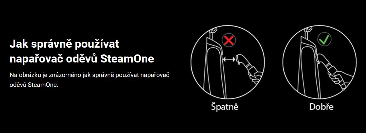 Napařovač oděvů SteamOne je nejšetrnější a nejrychlejší metodou žehlení. Pára vytvořená steamerem proniká přes látku, kterou rychle vyžehlí bez jejího poškození a nevytváří na oděvech žádné odlesky jako klasická žehlička. SteamOne je rychle připraven a oděvy žehlíte přímo na ramínku bez použití žehlícího prkna. Teplota páry 98°C navíc odstraní pachy a dezinfikuje.
