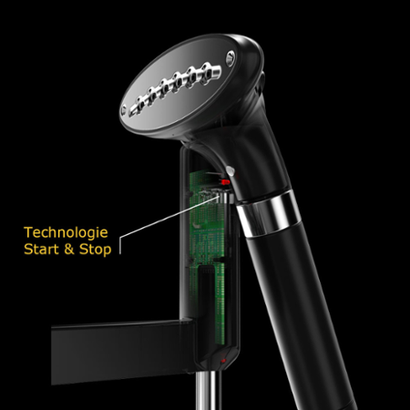 Napařovač oděvů SteamOne Stilys je vybaven inovativní technologií Start&Stop. Při vložení žehlící hlavy do držáku se pára automaticky přeruší a po vyjmutí žehlící hlavy z držáku se pára opět automaticky spustí.